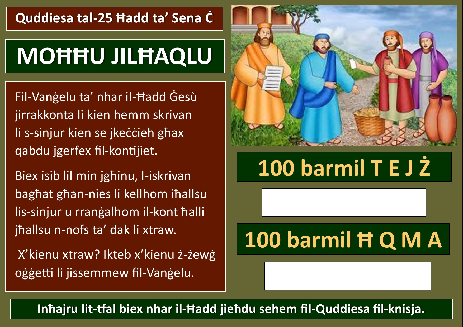 Inħajru lit-tfal permezz ta’ dan il-poster biex fil-weekend jieħdu sehem fil-Quddiesa fil-knisja jew isegwuha mal-familja minn fuq it-televiżjoni jew minn fuq is-sit tal-parroċċa. Bħala tħejjija, jridu jiktbu ż-2 oġġetti li xtraw li jissemmew fil-Vanġelu.
