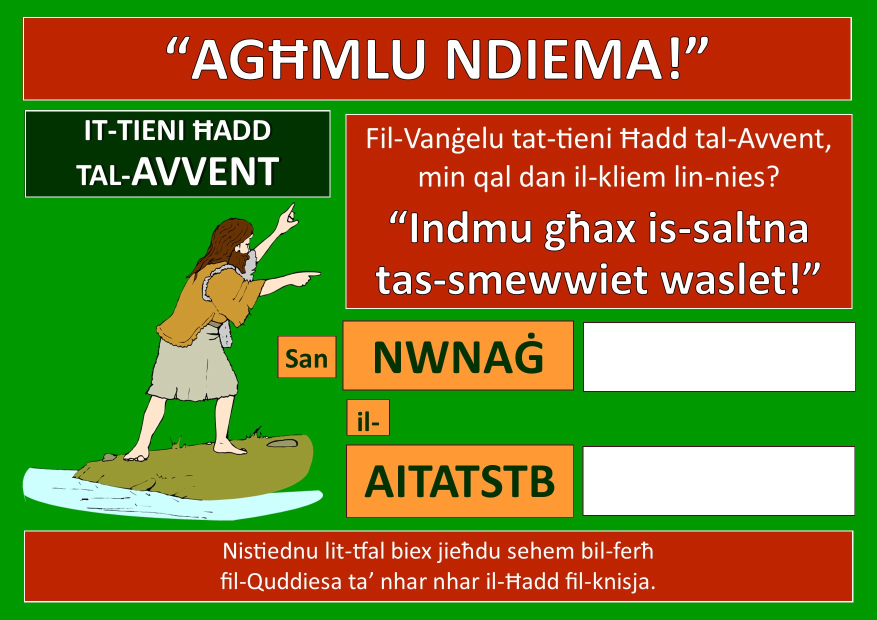 Ejjew mela nħajru lit-tfal permezz ta’ dan il-poster biex fil-weekend jieħdu sehem fil-Quddiesa fil-knisja kull nhar ta’ Ħadd mal-familjari jew mall-kuraturi tagħhom. Iridu jsibu tliet affarijiet tal-ħolqien li jogħġbuhom l-aktar.